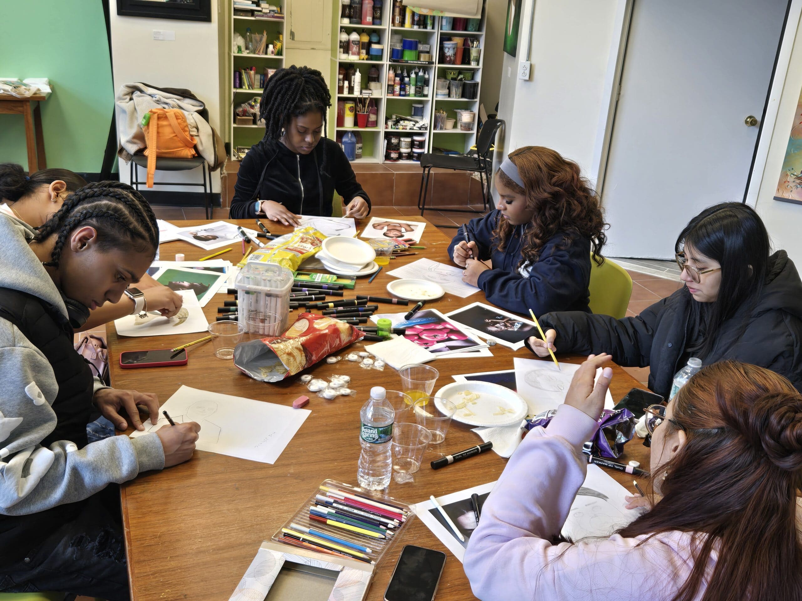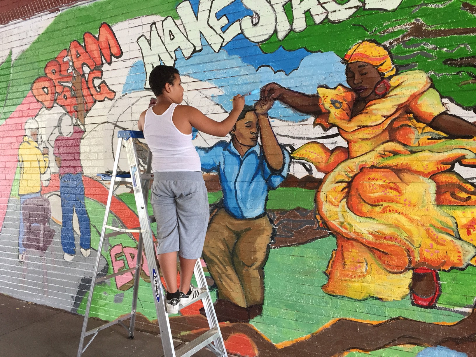Our 8-week Summer Mural Workshop is for advanced students, who serve as peer leaders and assist beginner students with graphic design concepts and skills, mural making projects, and launching art-related projects such as vending merchandise at local street fairs.